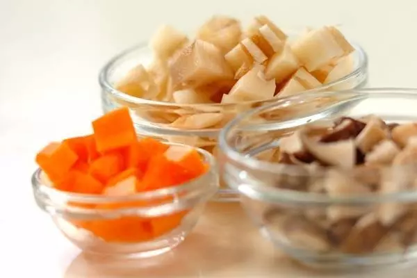 ・ギンナンはサッと水洗いしておく。レンコンとニンジンは皮をむいて1cm角に切る。シイタケは石づきを取り、1cm角に切る。