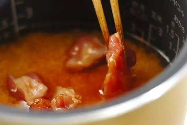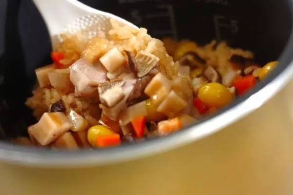 1、炊飯器に洗い米、<調味料>の材料、だし汁を注ぎ、下味を付けた鶏もも肉、ギンナン、レンコン、ニンジン、シイタケを入れ、スイッチを入れる。