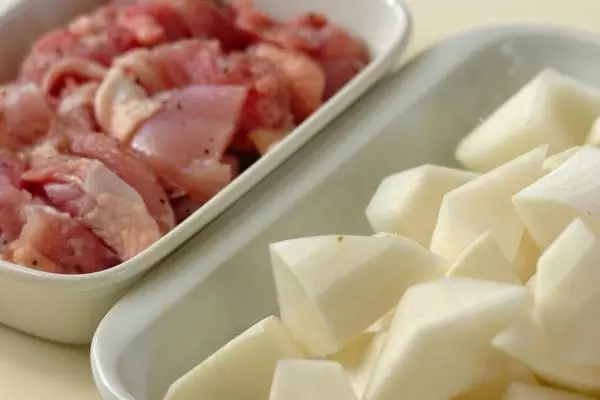 ・大根は皮をむき、ひとくち大の乱切りにする。鶏もも肉はひとくち大に切り、塩コショウをする。