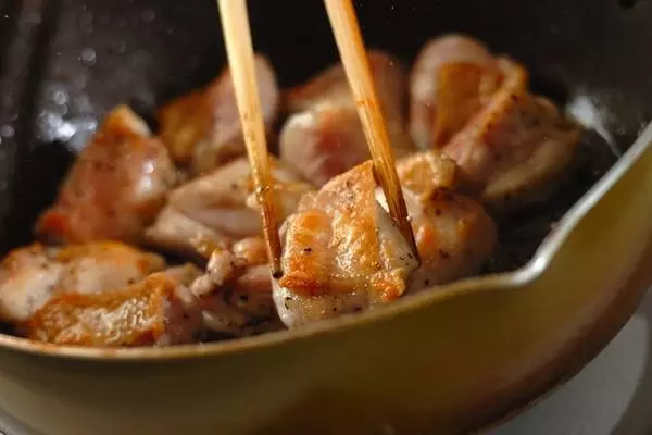 1、フライパンにサラダ油を薄くひき、鶏もも肉を両面焼き色がつくまで焼き、いったん取り出す。