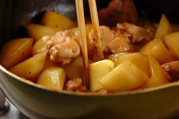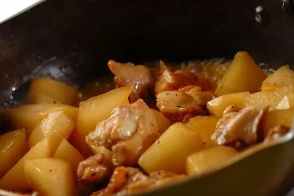2、(1)のフライパンに大根とだし汁を入れて、煮たったら<調味料>の材料、鶏もも肉を戻し入れ、時々混ぜながら煮汁が少なくなるまで弱めの中火で煮る。