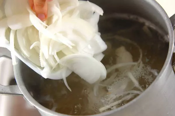 ・玉ネギは、縦薄切りにする。