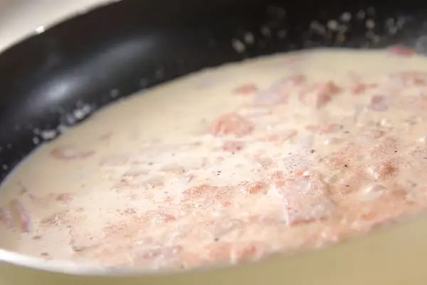2、フライパンに、タラコ、生クリーム、ベーコンを加えて中火にかけ、混ぜながら2分位煮る。