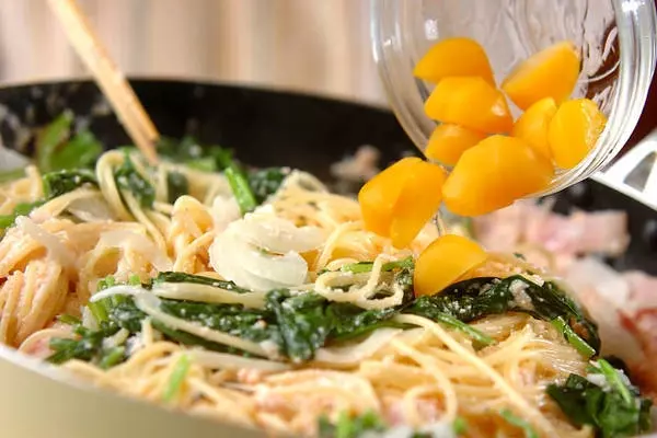 1、たっぷりの熱湯に塩を加え、スパゲティを袋記載の指定のゆで時間より30秒~1分短めにゆで、ザルに上げる。ゆで上がり1分前にホウレン草、玉ネギを加えスパゲティと一緒にゆでる。