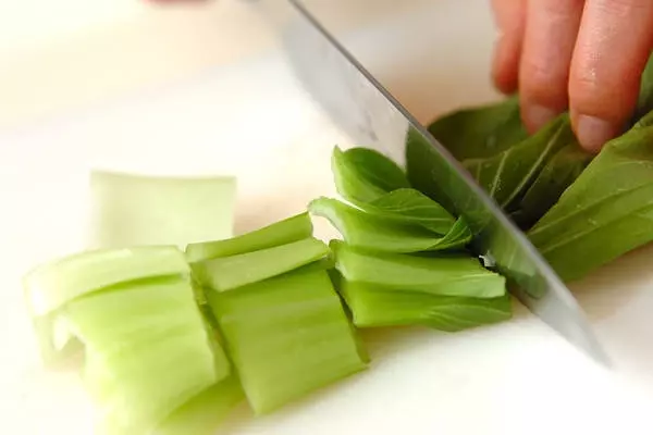 ・チンゲンサイは根元を切り落としてきれいに水洗いし、長さ3cmに切る。大きい場合は、さらに縦2~3つに切る。