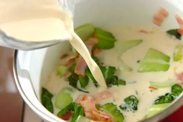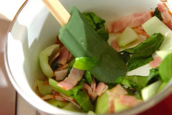 1、鍋にサラダ油を熱してベーコンを炒め、さらにチンゲンサイを加え、軽く炒め合わせる。