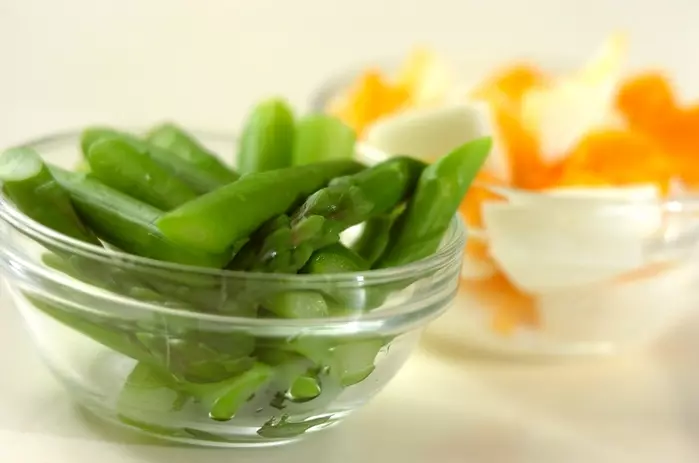 1、<アスパラと卵のサラダの工程>グリーンアスパラ 5本 は根元のかたい部分を切り落とし、かたい皮とハカマを取り除き、熱湯でゆでて長さを4等分に切る。