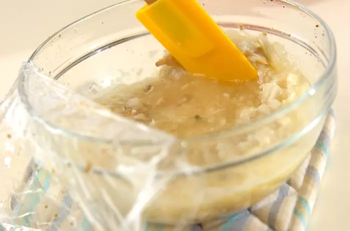 リゾットを混ぜる。ラップをし5分加熱後、もう一度全体を混ぜる。ラップを再度かけ、さらに5分加熱する。