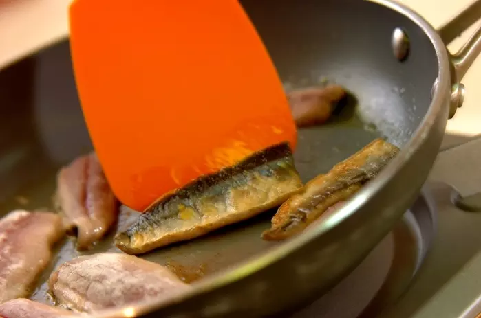 サンマの水分をキッチンペーパーで拭き取り、薄く小麦粉 大さじ1 をからめる。フライパンに バター 10g を入れて中火で熱し、サンマの両面に美味しそうな焼き色がつくまで焼き、いったん取り出す。