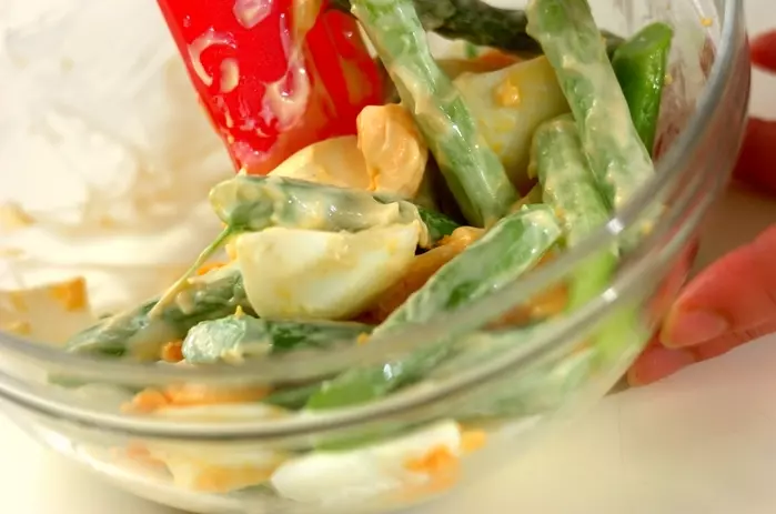 ボウルに粗熱が取れたグリーンアスパラとゆで卵を入れ、マヨネーズ 大さじ2 を加えて和える。塩コショウ 少々 で味を調え、器に盛る。