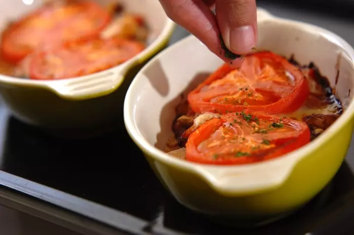 耐熱容器にトマトソースを少量広げて ニンニク 1/4片 を並べ、(1)のサンマをのせ、残りのトマトソースをのせる。粗びき黒コショウ 少々 を振り、ピザ用チーズ 50g を散らして輪切りのトマト 4枚 をのせる。