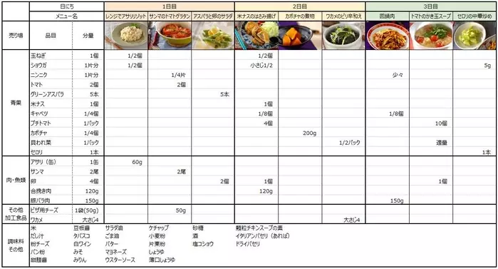 『食材使い切りのラクうま献立』は常備品や保存食以外の生鮮食材は1日3品を3日で使い切れるように献立が構成されています。
