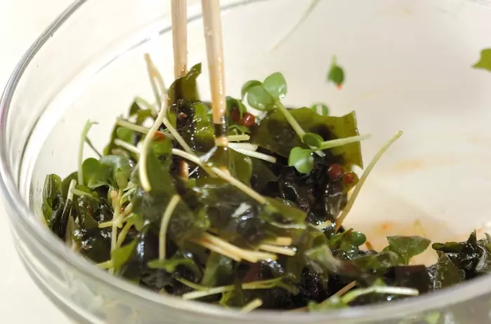 ボウルで、豆板醤 小さじ1/2、しょうゆ 小さじ1、ゴマ油 大さじ1 を混ぜ合わせる。ワカメ、貝われ菜を加えて和え、器に盛る。