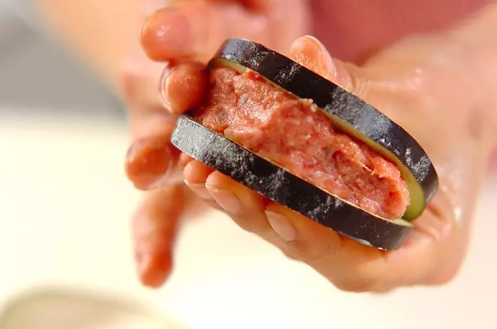 ナスの水気を拭き取って小麦粉 小さじ2 を薄く振り、タネを切り口にはさむ。