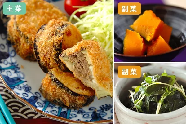 大きな米ナスを生かしたボリューム満点なはさみ揚げが主役の献立。さっぱりとしたわかめの和え物に、甘いかぼちゃの煮物を添えた満足感のある1食です。調理時間 約45分