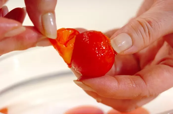 1、<トマトのかき玉スープの工程>プチトマト 10個 はヘタを取り、湯むきをする。片栗粉 小さじ1/2、水 小さじ1 を混ぜ合わせて水溶き片栗粉を作る。貝われ菜 1/2パック は根元を切り落とし、長さを2等分にする。