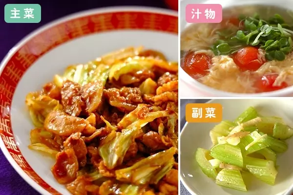 さっと炒めたキャベツの炒め物をメインに、彩り豊かな副菜を添えた中華献立です。調理時間 約25分