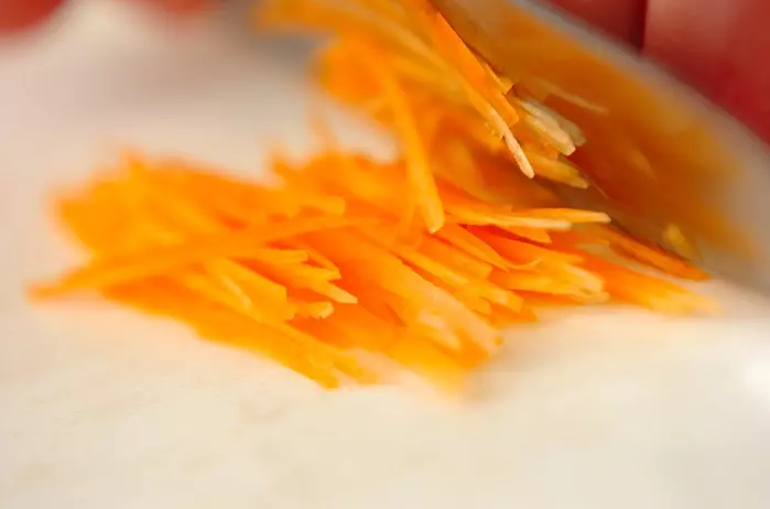 ニンジン 2/3本 は皮をむいて、長さ4~5cmのせん切りにする。