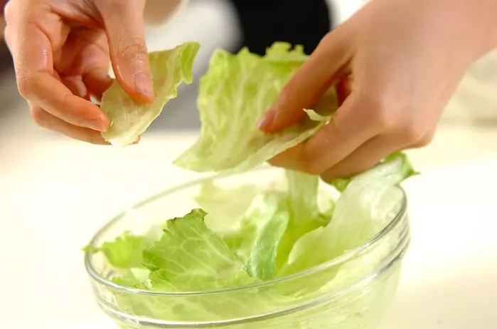 レタス 1/4個 は手で食べやすい大きさにちぎる。卵 1個 は溶きほぐす。