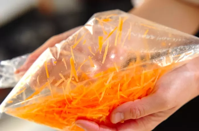 抗菌のビニール袋にニンジン、塩 小さじ1/2 を入れて袋に空気を入れる。口をしっかり持ち(風船のように)、よく振ってニンジンに塩をからめる。