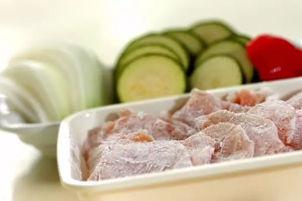 ・鶏むね肉は厚さ1cmくらいの薄めの削ぎ切りにして塩コショウをする。片栗粉を全体にまぶして、余分な粉をはたく。