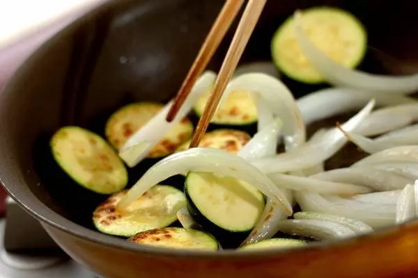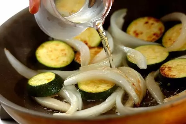 2、(1)に白ワインを入れ、水分がなくなるまで炒めたら、分量の水を入れ、蓋をしてズッキーニが柔らかくなるまで煮る。