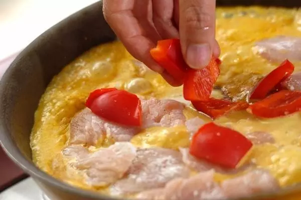 3、(2)に牛乳と<調味料>の材料を入れ、混ぜ合わせる。フツフツしてきたら鶏むね肉を1枚ずつ広げて入れ、上に赤パプリカを入れる。蓋をして、弱火~中火で煮る。
