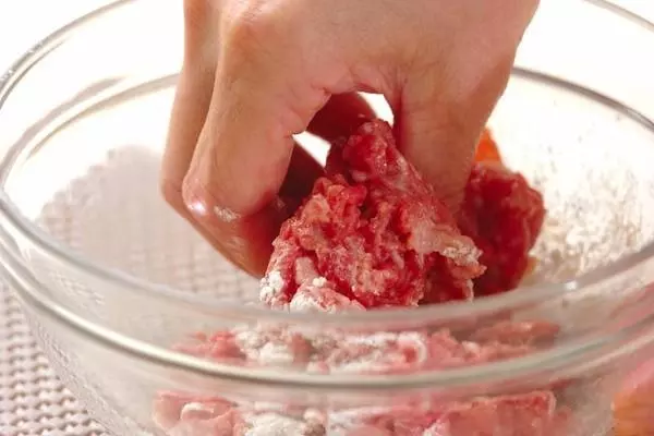 ・ボウルで<下味>の材料を混ぜ合わせて牛肉をからめ、小麦粉をまぶす。牛肉は長ければ長さ3cmに切る。