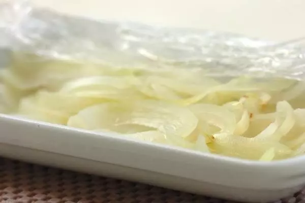 ・玉ネギは縦薄切りにして耐熱容器に入れ、水をまわし入れてラップをふんわりとかけ、電子レンジで5分加熱する。