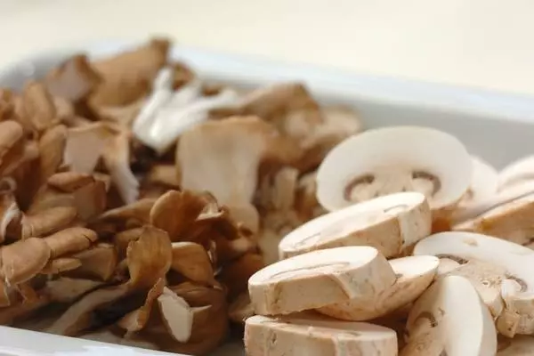 ・マイタケは、ある場合は石づきを切り落とし、食べやすい大きさに裂く。マッシュルームは汚れを取り除き、縦4等分の薄切りにする。