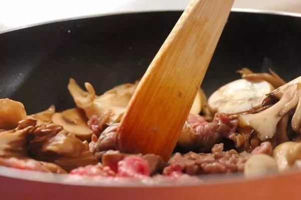 1、フライパンにマイタケ、マッシュルーム、バターを入れて中火で炒め、しんなりしたら牛肉を加えてほぐすように炒め合わせる。