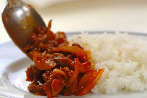2、玉ネギを蒸し汁ごと加え、<ソース>も加えて煮て、トロミがついたら分量外の塩で味を調える。