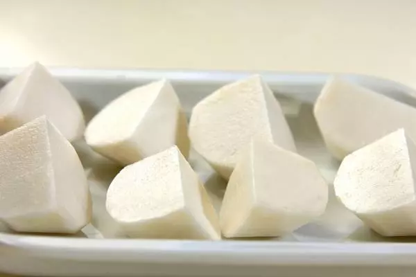 ・サツマイモは皮ごと幅1cmの輪切り、または半月切りにして水に放つ。カブは皮をむき、4~6等分のくし切りにする。