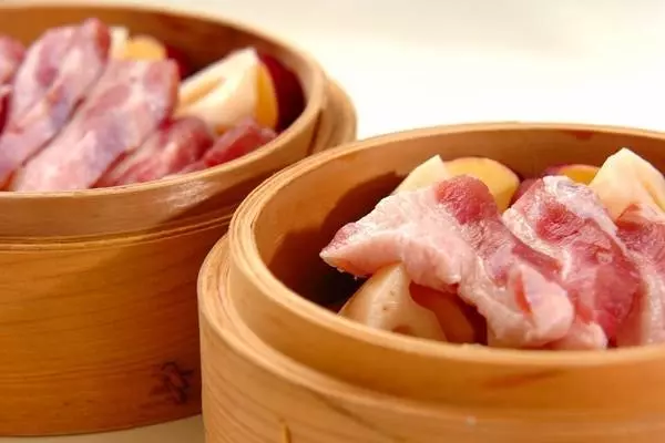 2、せいろに豚バラ肉、レンコン、水気をきったサツマイモを並べ、5~6分蒸し、火を通す。