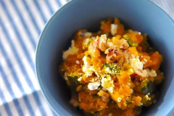 デザート感覚でも楽しめる「カボチャのクリスピーサラダ」でカボチャと合せているのはカッテージチーズ。