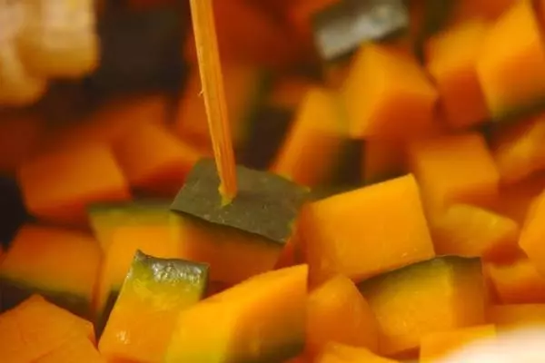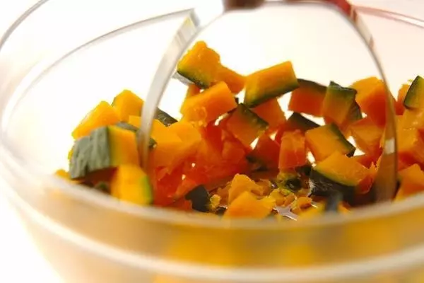 3、フォークの背やマッシャーで、お好みの大きさまでカボチャを潰す。