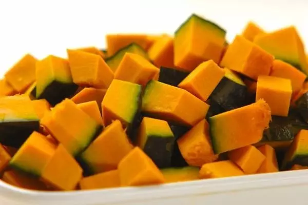 1、カボチャは種とワタを除き、1cm角に切る。クルミは、フライパンで軽く炒って粗く砕く。