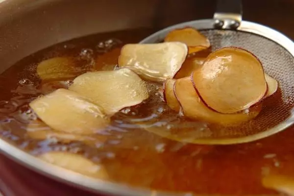 1、揚げ油を170℃に熱し、サツマイモをからりと揚げる。