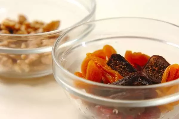 ・<ドライフルーツ>の材料は10分ほどぬるま湯に浸けて戻し、水気を拭いて半分に切っておく。クルミは予熱なしの170℃のオーブンで約8分素焼きしておく。