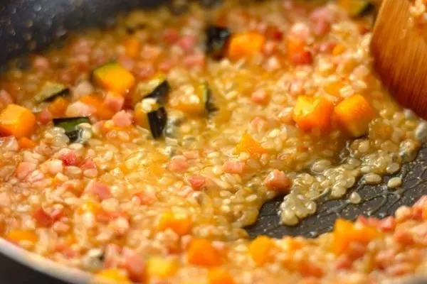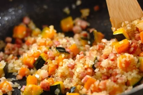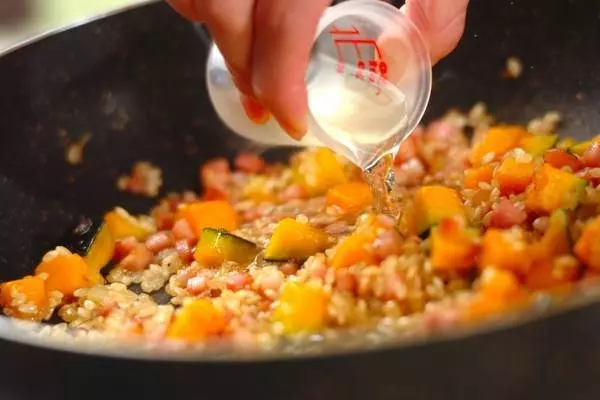1、フライパンにバターを熱し、玉ネギとカボチャ、ベーコンを加えて炒める。玉ネギが透き通ってきたら、お米を加えて炒め合わせる。