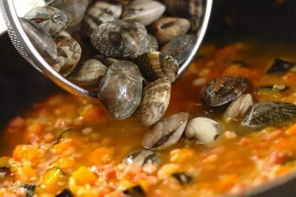 4、残りのスープとアサリを加え、フライパンに蓋をして弱めの中火で10~12分時々混ぜながら煮る。蓋を取り、まだ<スープ>が残っている場合は、強火で<スープ>が少なくなるまで火を入れて下さい。