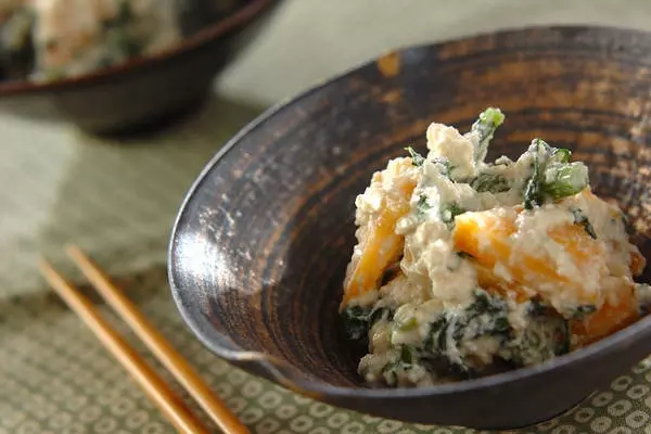 ほろ苦く、甘い簡単一品! 「柿と春菊の白和え」