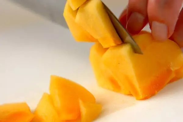 ・柿はヘタを取って皮をむき、イチョウ切りにする。