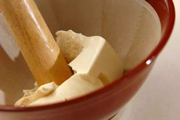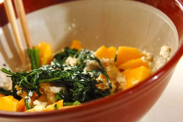 1、すり鉢に豆腐を入れ、なめらかになるまでする。練り白ゴマ、しょうゆ、砂糖、塩を加えて混ぜる。