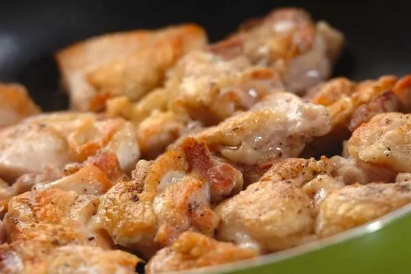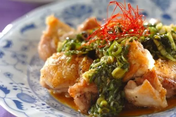 2、フライパンにサラダ油を中火で熱し、皮を下にして鶏もも肉を並べ入れ、両面をこんがりと焼く。器に盛って(1)をかけ、糸唐辛子をのせる。