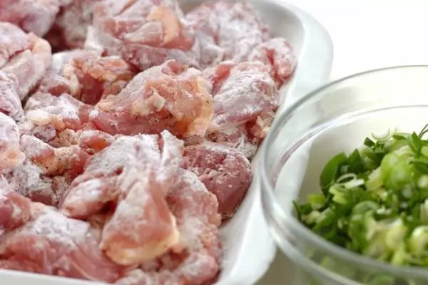 ・鶏もも肉は余分な脂を取り除き、食べやすい大きさに切って塩コショウし、全体に片栗粉をまぶす。青ネギは小口切りにする。