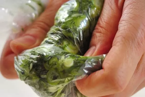 1、抗菌袋に青ネギと塩を入れ、袋の上から軽くもんでしんなりさせる。<タレ>の材料を加えて混ぜ合わせる。