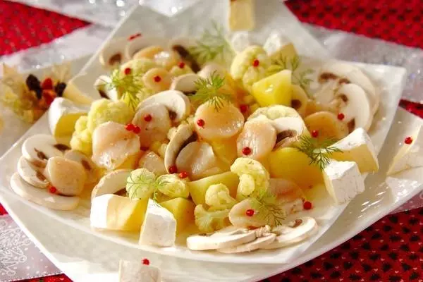 2、<ハニーレモンドレッシング>のボウルにホタテ、カリフラワー、ジャガイモを入れて和え、マッシュルーム、カマンベールチーズと共に器に盛る。ピンクペッパーとディルを飾る。