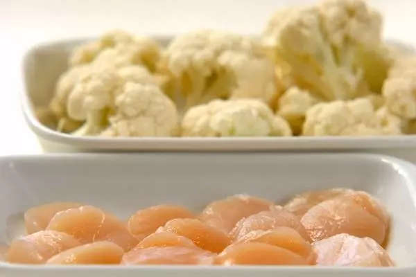 ・ホタテは横半分にスライスする。カリフラワーは小房に分け、食べやすい大きさに切る。