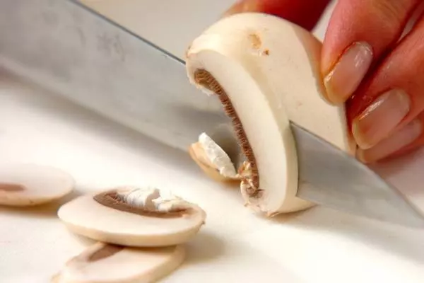 ・ジャガイモは皮をむいて、ひとくち大に切って水にさらす。マッシュルームは幅2mmの薄切りにする。